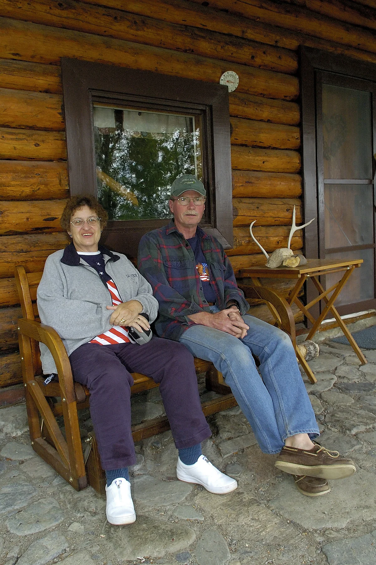 The communal dining room in the lodge, porch, a typical cabin, and the "bar" located in the frigid mountain stream