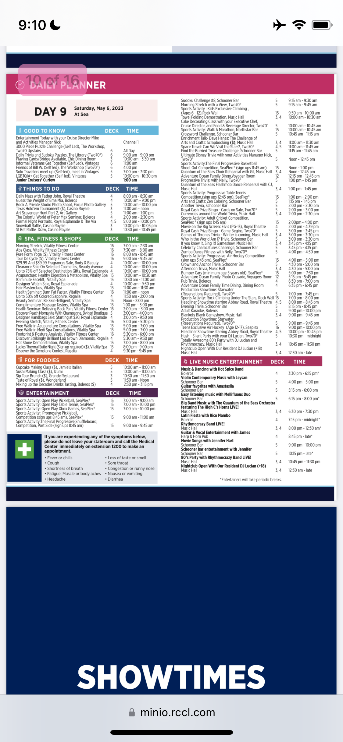 Everything is is listed in the app, some things like dining and fitness classes are reservations, where you are expected (and in the case of fitness classes, if you fail to show up you’ll be charged a small fee which is donated to charity…apparently the road to the gym is paved with good intentions!) Then there are bookings, which are just things you’d like to do or see but you don’t have guaranteed admission. We found the app helpful, but it required verification. The times for events can change and if it’s already reserved, be sure to check the time on the main schedule because changes didn’t seem to port over to your own plans, which made us 15 minutes late to Zumba class.