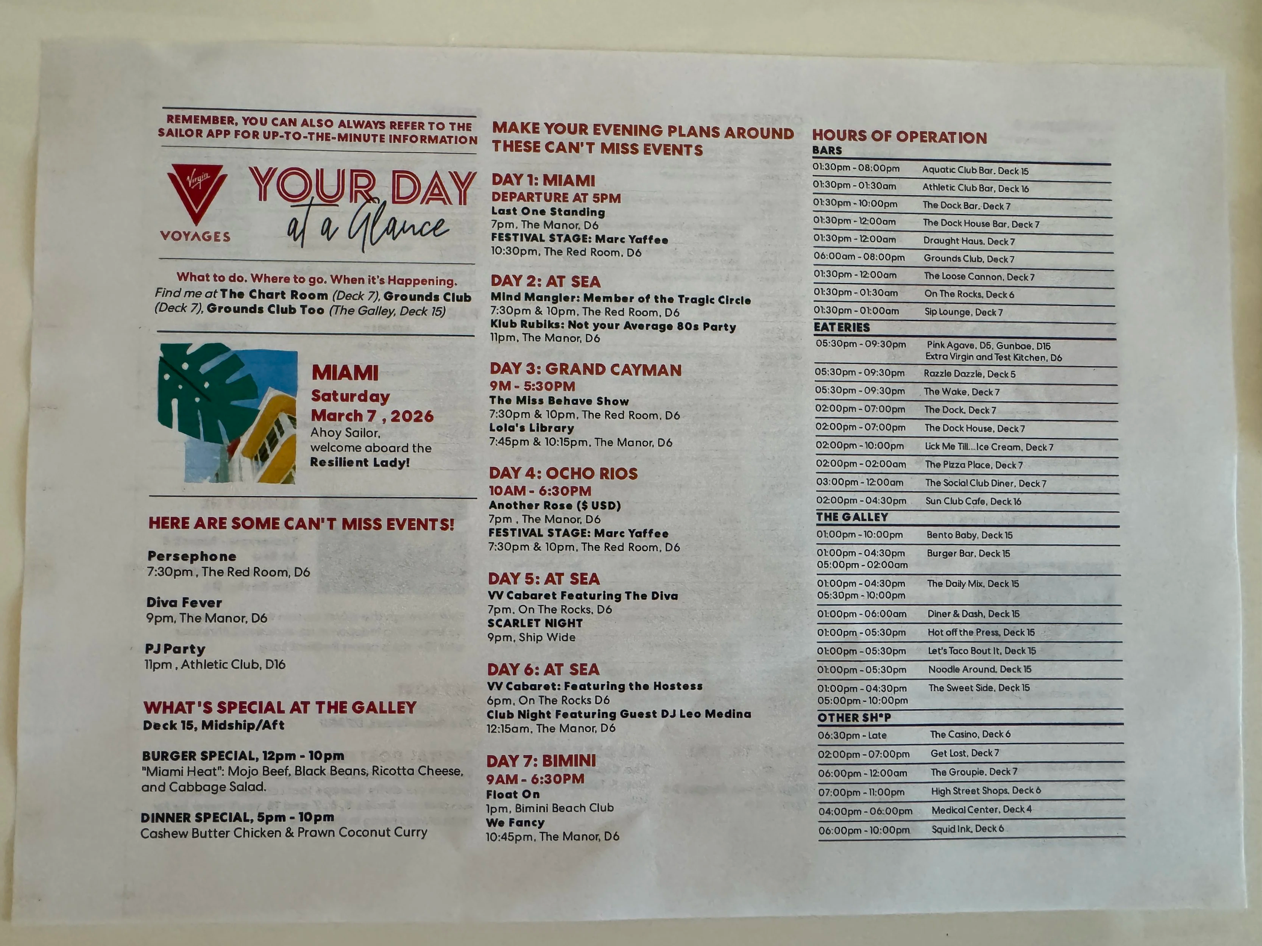 Many Sailors don’t take ships excursions; most feel comfortable booking independent excursions or wandering on their own. One excursion we took with Virgin Voyages in Grand Cayman, a boat based, snorkeling and beach adventure, was really well run and fun, and the crowd was not too large fr the facilities, which is nice. A second excursion we booked, the Miami Hop On Hop Off bus trip to kill time for people with later flights, was mostly killing time waiting for the organizers to show up, killing time in the sun waiting for them to figure out how to check everyone in, and more time waiting to accommodate luggage. Eventually, we bailed on the excursion and took an uber to the airport when it became clear that we’d only have about an hour to enjoy the Hop On Hop Off portion of the excursion in Miami after the amount of time it took to get organized at port!