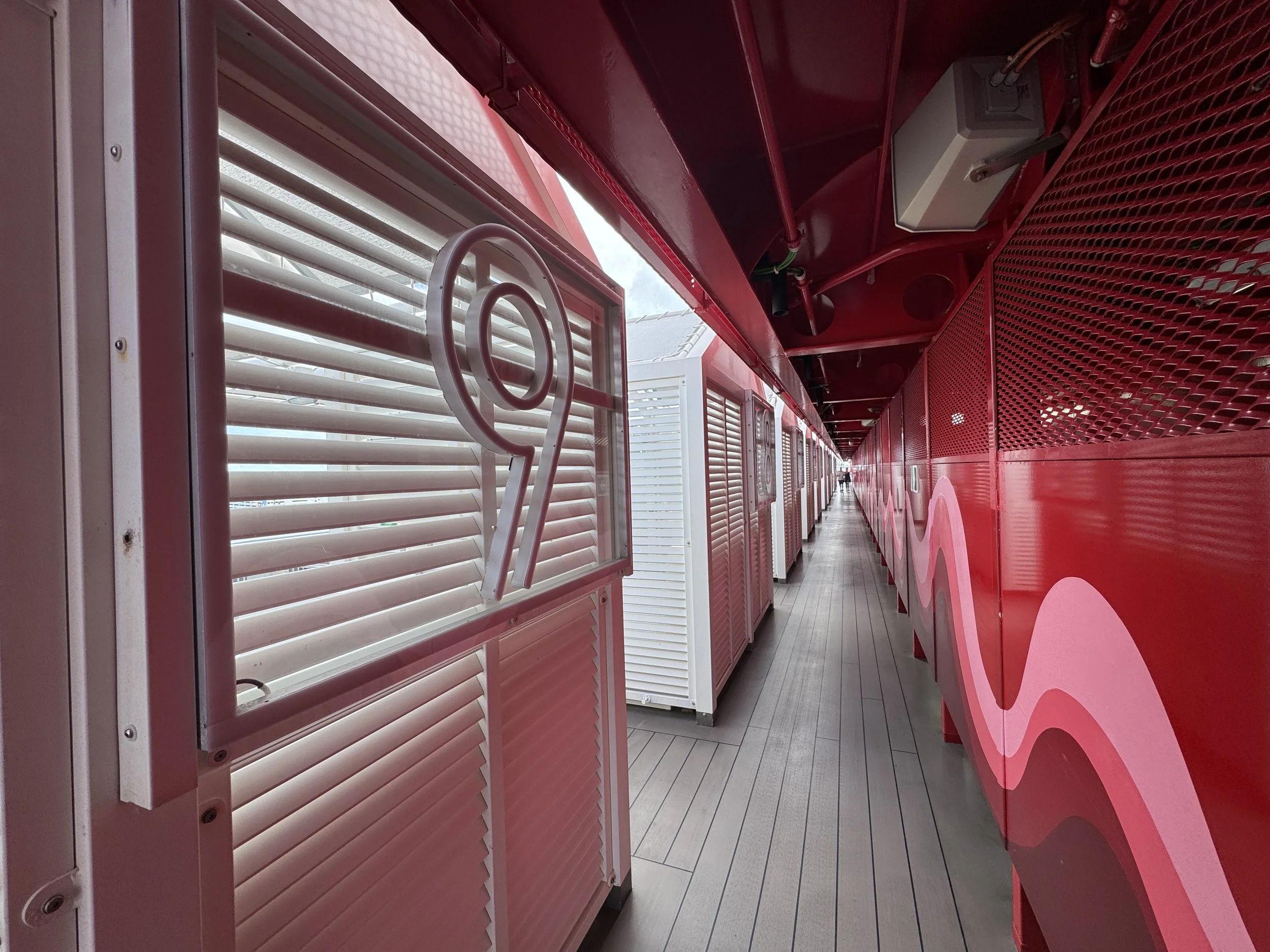 When I first boarded, while exploring the ship, I wandered into an area and for a moment thought I had unexpectedly entered a crew only area. The interior of Resilient Lady often gives me college dorm vibes, a lot of red and a lot of grey metal. The ships are much more enclosed and linear than other modern ships, which have open centrums, or promenades, with long views into other parts of the ship. The Virgin ships, which are all designed similarly, are designed as pass through spaces with surprises along the way.
