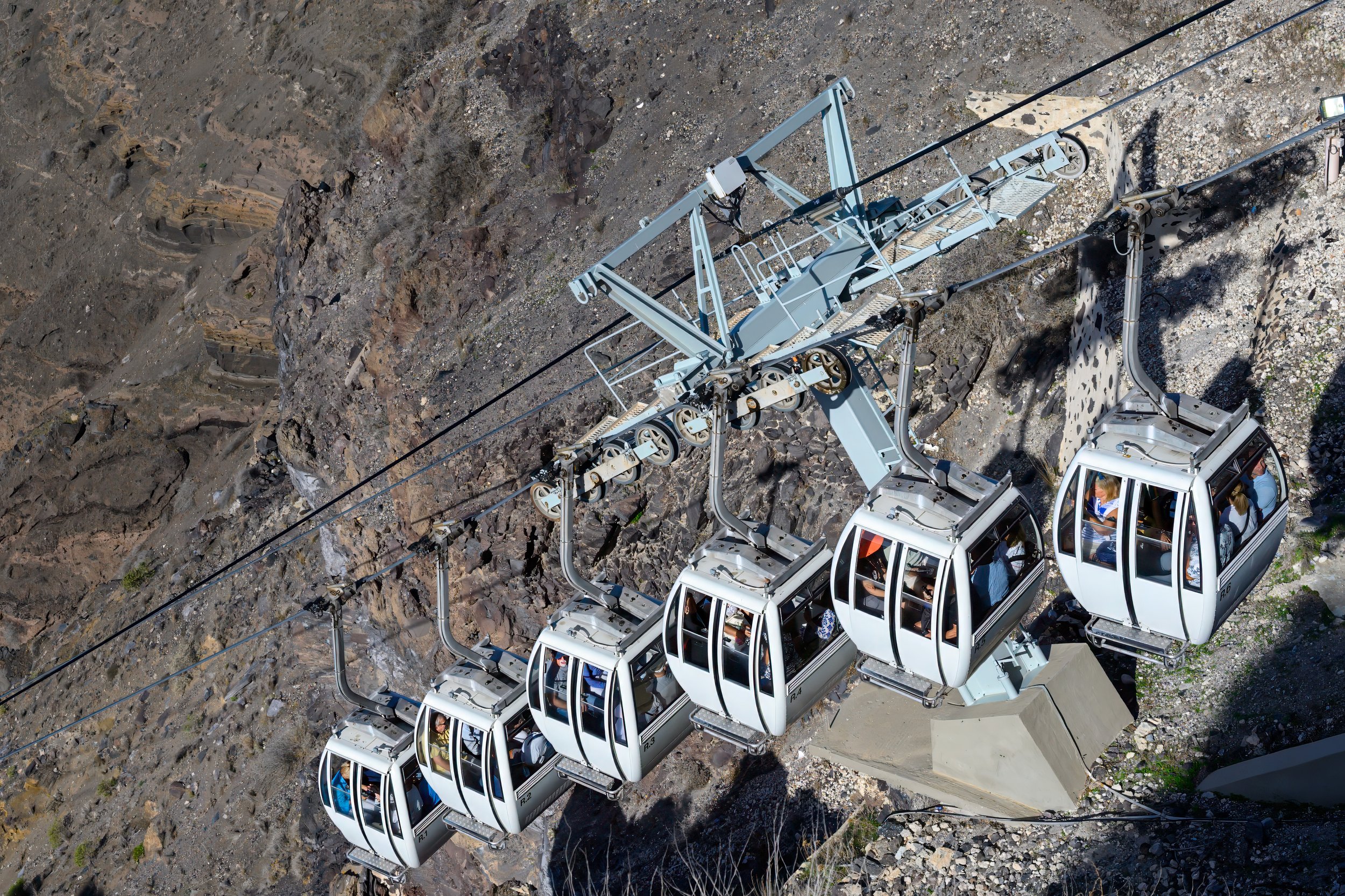 Arriving in Santorini via cruise ship was challenging because the only way from the ship to the town of Fira on the hill is to take a limited capacity gondola up and down the hill. At the time we visited the steep walking trail was closed for renovations.