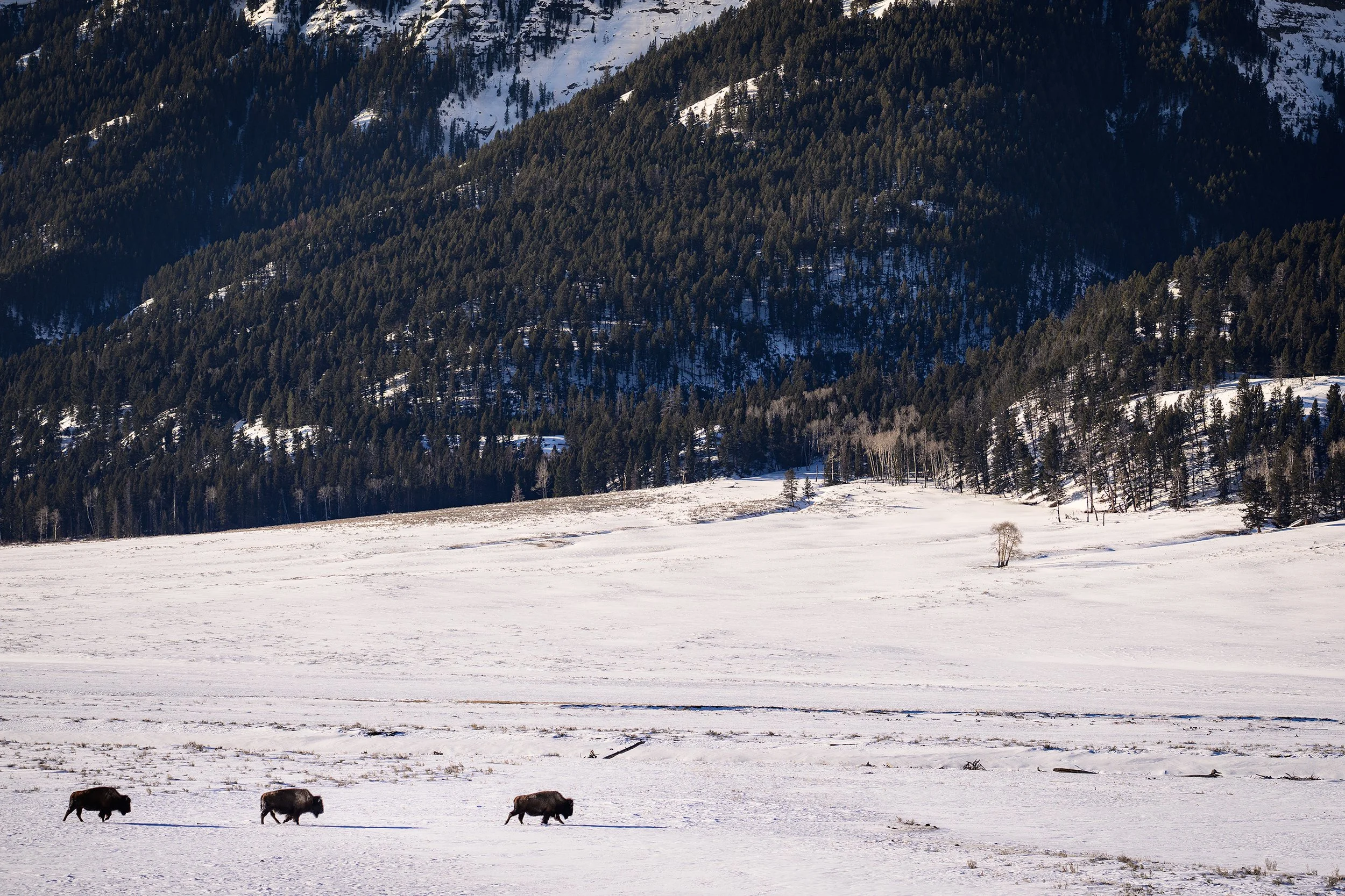 One of the advantages of traveling in winter, despite the bitter cold, is that the snow in higher elevations encourages the ungulates (hoofed animals) to graze a lower elevations which are closer to the road. In turn their predators, such as the wolves, have an easier time hunting during winter. Because of this, winter provides one of the best times to explore the wildlife in Yellowstone; when its closer to the road and easier to spot against the white snow and the best opportunity to spot predators hunting from the road.